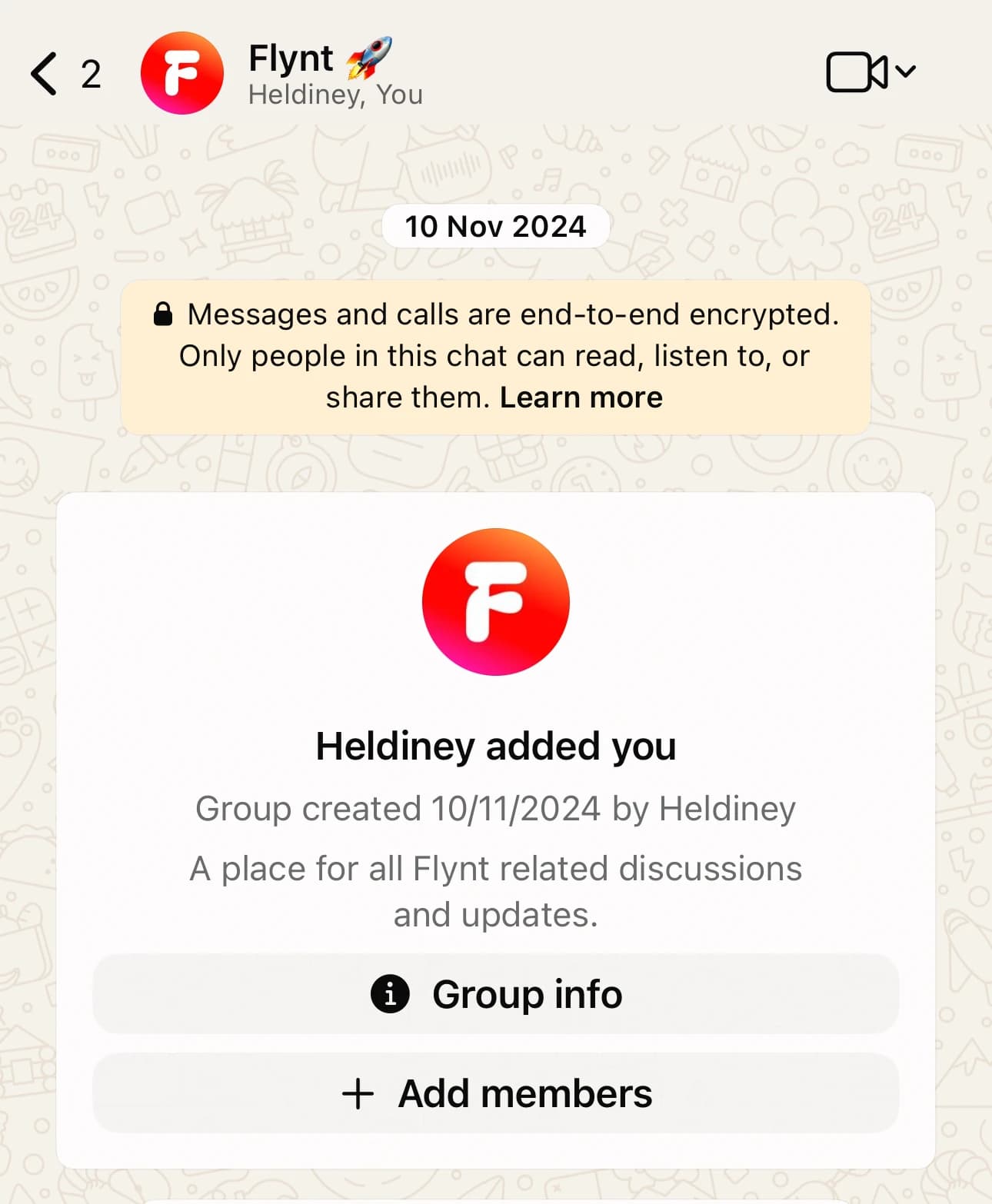 The launch text — 10 November 2024 A WhatsApp group, a name, and an idea that stuck. That’s how Flynt began.
